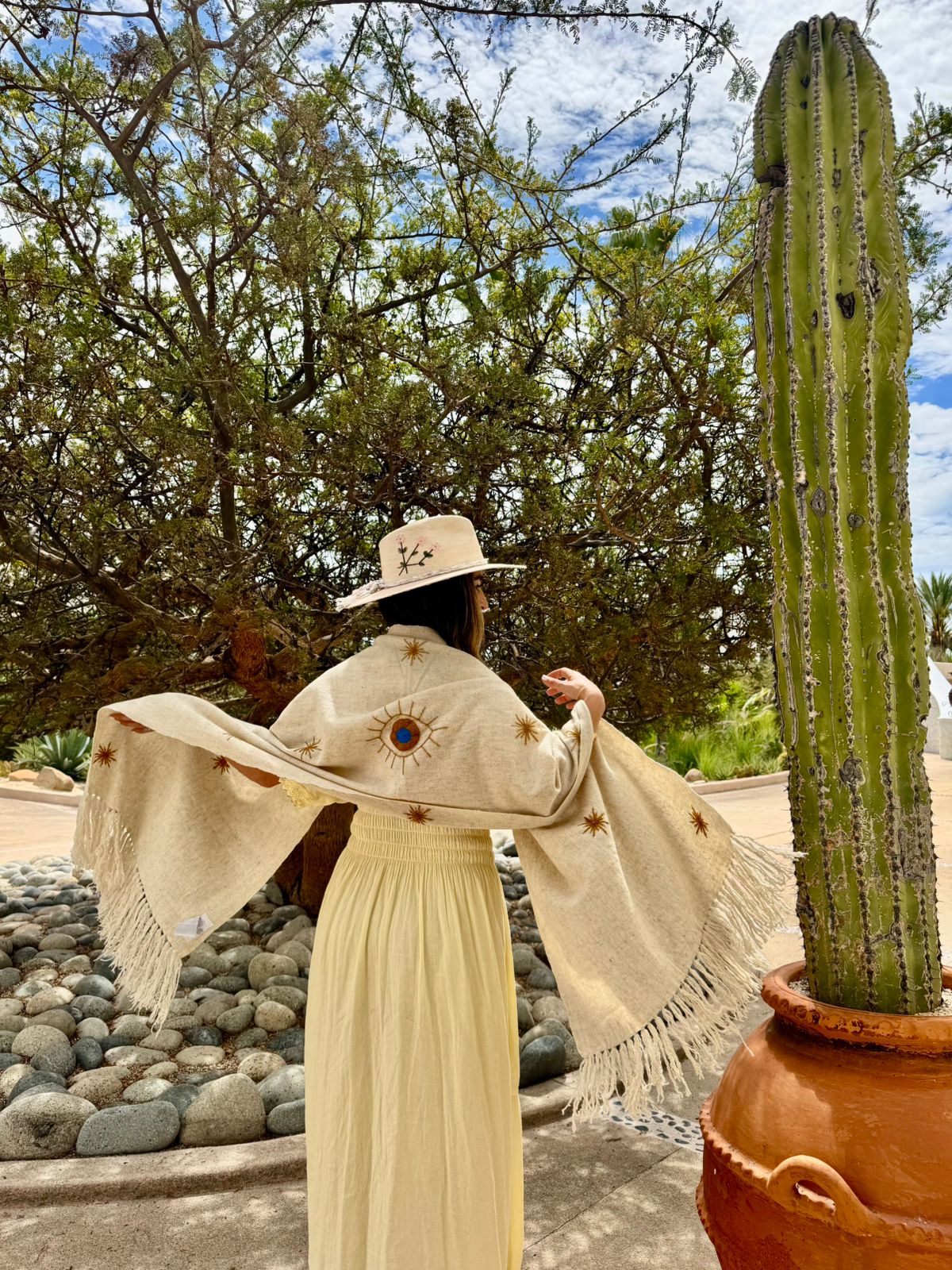 Available in soft silk and warm wool, these shawls are designed to move with you—whether draped over your shoulders at sunset or styled for a crisp evening.