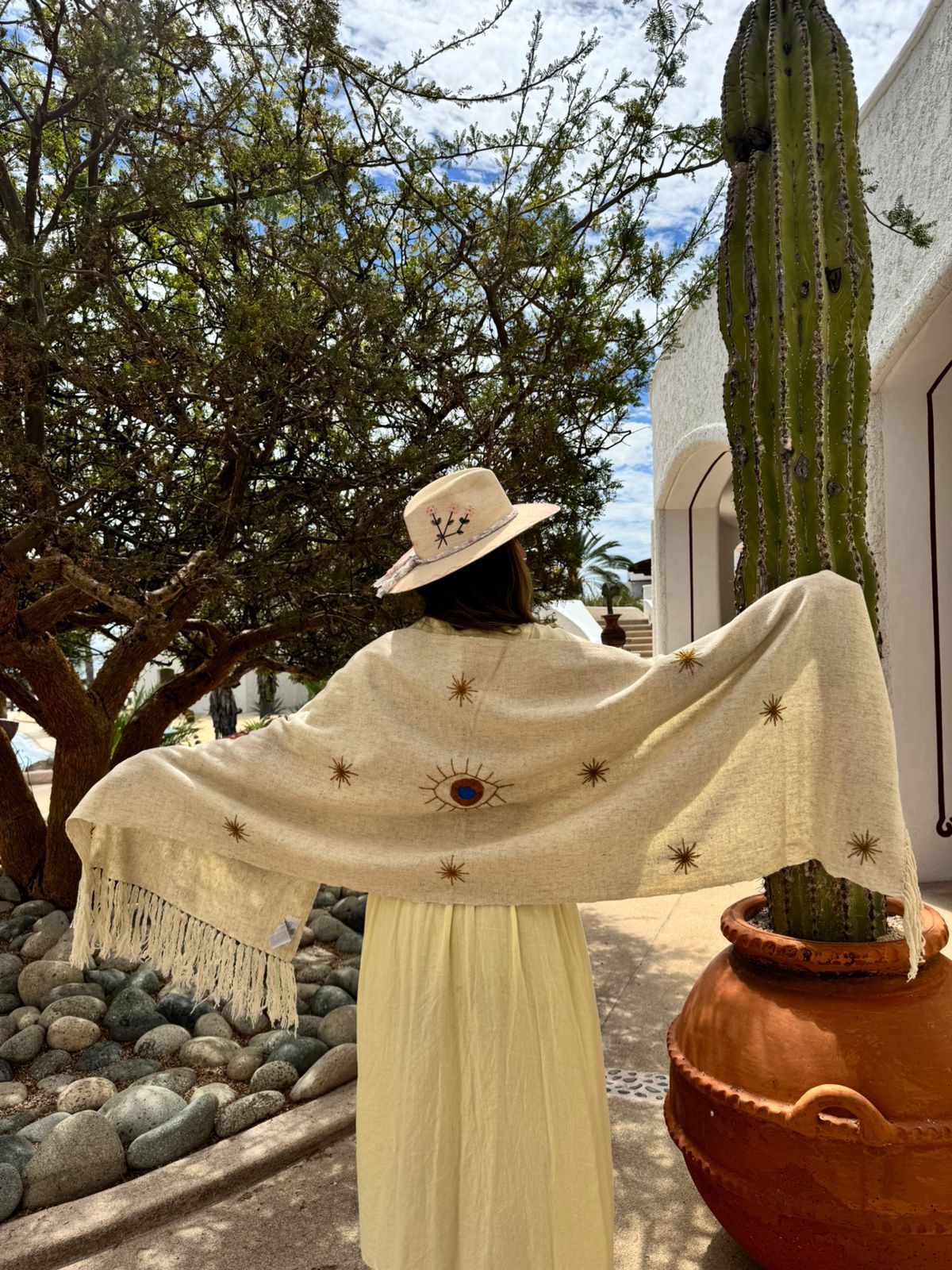 Crafted from 100% natural fibers and entirely handmade, each piece is delicately embroidered with thoughtful details that elevate its timeless appeal.