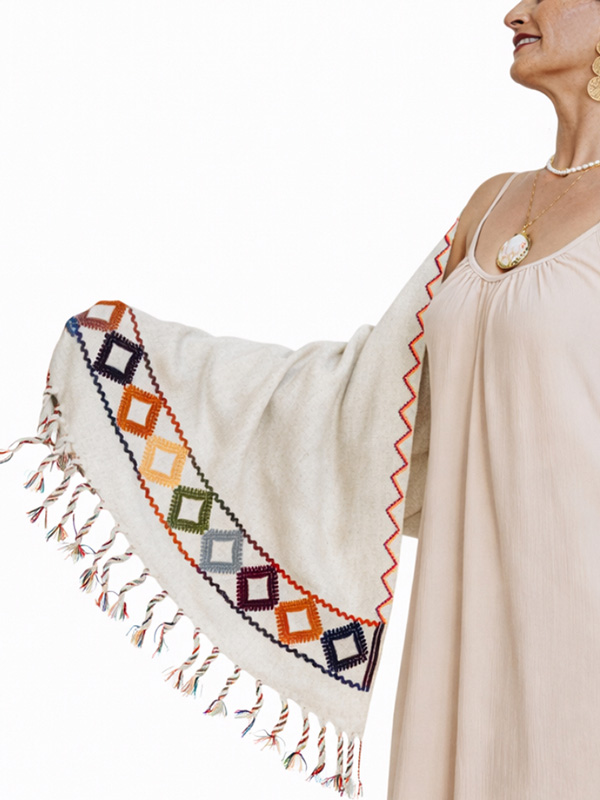 Available in soft silk and warm wool, these shawls are designed to move with you—whether draped over your shoulders at sunset or styled for a crisp evening.